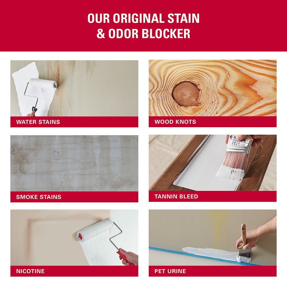 KILZ ORIGINAL Oil-Based Primer is a powerful stainblocking formula that blocks most heavy interior stains including water, smoke, tannin, ink, pencil, felt marker, grease, and also seals pet, food and smoke odors. Trusted by pros for over 40 years, excellent sealing and adhesion properties help paint adhere to most interior surfaces leading to better results. Use on wood, drywall, plaster, paneling, wallpaper, masonry, brick, painted metal and properly prepared glossy surfaces. Not recommended for mold or mildew-prone surfaces or on flooring.