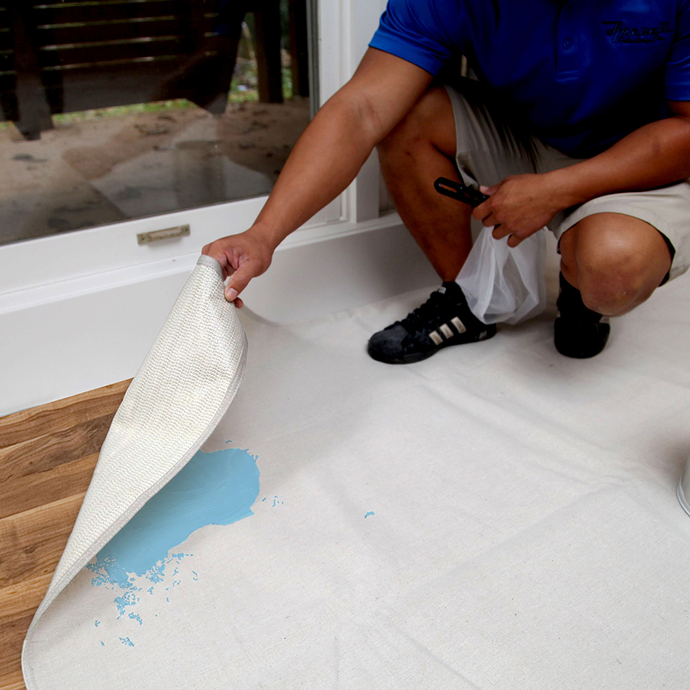 Upgrade your traditional canvas drop cloth with Trimaco’s Stay Put Canvas Plus. This innovative drop cloth is 300% more slip-resistant than traditional 8oz canvas drop cloths, providing slip and leak-resistant protection that stays in place. The Stay Put Canvas Plus features an additional layer of plastic, making it leak-resistant to all paints and stains, ensuring your surfaces remain protected during any painting or staining project. With the Stay Put Canvas Plus, you can reduce worry on the job with less slipping and more working. This slip-resistant canvas drop cloth is great for painting and staining and will lie flat throughout the duration of the job. Its three-layer construction includes an absorbent canvas top, a leak-resistant plastic center, and a grippy, slip-resistant backing. Use the canvas side up to minimize tracking and keep your work area clean. This drop cloth has orange thread stitched along the outside edges so you can easily see which drop is slip resistant while on the job.
