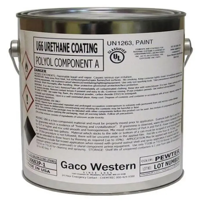 GacoFlex U66 is a two‐component, fire retardant polyurethane elastomeric waterproofing coating. It is for use on roofs, mechanical room floors and walking and traffic decks where excellent weathering, fire retardance, toughness, fast cure and good solvent resistance are needed. Suitable substrates include concrete, plywood, sprayed in place polyurethane foam and metal.