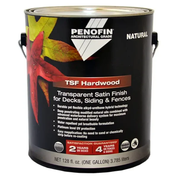 Penofin Architectural Grade Transparent Hardwood Coating delivers the highest level of quality, protection and beauty. Designed to provide a protective yet breathable water and UV resistant barrier that enhances and preserves the rich exotic look of hardwoods. Utilizing an innovative blend of deep penetrating modified natural oils, cutting‐edge waterborne alkyd‐urethane hybrid resin technology combined with polymerized silicone for superior surface and internal water repellency. This advanced combination of technologies allows for natural oils and resins to penetrate deep into the fibers of the wood without blocking the pores, allowing for maximum internal and external water repellency while maintaining breathability. Supreme level UV resistance through the use of a multi‐phase UV protection package composed of high grade trans‐oxide pigments, Nano‐technology UV blockers and UV photo‐light stabilizers. This durable yet flexible alkyd‐urethane hybrid system delivers 2 year protection on decks and 4 year protection on fences and siding.