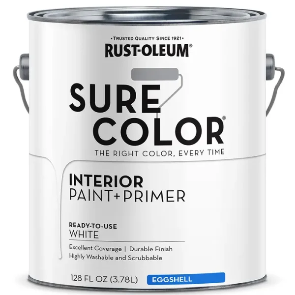 Sure Color paint and primer in one comes in pre‐mixed colors, saving you time and money on your interior paint project. The ready‐to‐use gallons make it easy to refresh any space in your choice of timeless neutrals or on‐trend colors. Sure Color Interior Wall Paint can be used on drywall, wood, aluminum, steel and brick surfaces. Eggshell paint has a low‐luster finish, making this the most popular sheen for all living spaces. Recommended for bedrooms, dining rooms and living rooms.