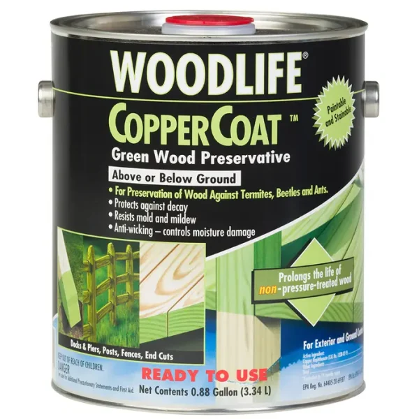 Woodlife CopperCoat Green Wood Preservative is a multi‐purpose, EPA‐registered, insecticidal wood preservative designed to protect exterior untreated or pressure‐treated wood in below ground, ground contact, fresh water contact or above ground installations. CopperCoat prevents attack from termites and other wood boring insects while protecting against rot and decay. Its anti‐wicking property resists moisture absorption through end cuts for greater control of dimensional warping, splitting and end‐checking. Plus, its paintable /stainable formula makes this product an excellent preservative primer for wood roofing, millwork and trim. WoodLife CopperCoat uses include, Multi‐purpose preservative for below ground contact, fresh water contact or above ground installations. Use on all species of untreated or pressure‐treated lumber and plywood. Ideal for docks and piers, fence posts, poles, pickets and rails, construction posts, foundation sills, stairs, porches and steps, landscape timbers, planters, arbors, trellises, gazebos, storage sheds, roofing shingles or other exterior wood exposed to moisture, weather or wood destroying insects. Excellent pre‐paint / pre‐stain primer for wood windows, doors and frames, siding shakes and shingles or other above ground exterior wood exposed to moisture contact. Also highly recommended for pressure treated wood and end cut protection, especially on decks. NOTE: To comply with AWPA M‐4 Standard, apply Woodlife Coppercoat to all end cuts, holes, and damaged areas on pressure treated lumber. MPI #37 Certified. Refer to the MPI website for the most current listing of MPI certified products.
