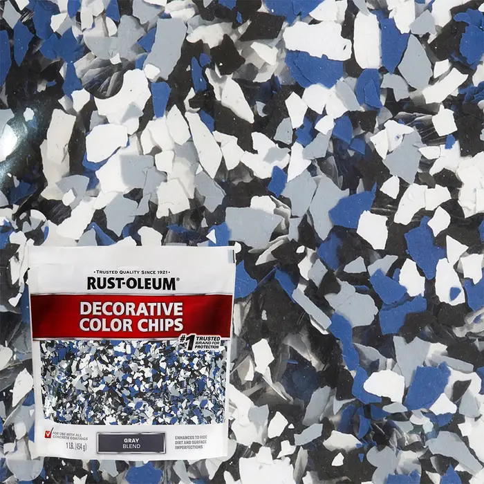 Rust‐Oleum Decorative Chips are designed for use with any one‐part or two‐part concrete floor coating. When sprinkled onto a freshly coated surface, these decorative chips bond to the wet film to become a permanent part of the coating. Rust‐Oleum Decorative Chips also help hide dirt and surface imperfections and can be used with water‐based or solvent‐based concrete coatings. For use in: garages, carports, laundry rooms, basements, porches, patios, walkways and pool decks.