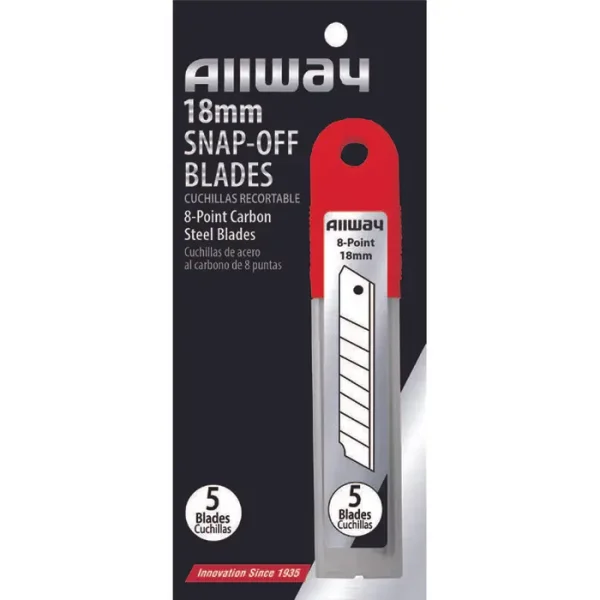The ALLWAY 8-point 18mm Carbon-Steel Snap-Off Blades come conveniently packed in a carrying case. Made of high carbon steel, these blades are crafted with utmost precision, ensuring professional-grade quality. With their professionally ground and honed edges, these blades are super sharp, guaranteeing clean and precise cuts every time. The 18mm size offers 8 break points, allowing for multiple fresh cutting edges without the need for constant blade changes. Experience the reliability and sharpness needed for a wide range of cutting tasks.