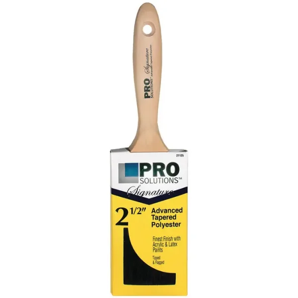 Pro Solutions Signature Advanced Tapered Polyester is our premium‐grade paint brush containing an exclusive blend of firm filament that delivers greater control and a smooth finish with today’s heavy‐bodied and low VOC paints. Ideal for use with all sheens of interior and exterior water‐based, oil‐based and alkyd paints, primers, stains, and clear finishes. Available in either flat or angular‐sash, with a variety of hardwood handle styles including beavertail, standard, short or rattail.