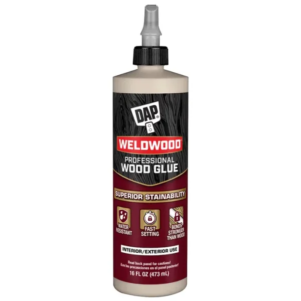 Weldwood Professional Wood Glue is a professional grade premium glue that provides fast, strong bonds for most porous and semi‐porous materials. The Polyvinyl Acetate formula provides superior stainability and water resistance when cured and allows for easy immediate water clean‐up.