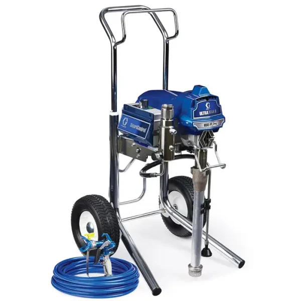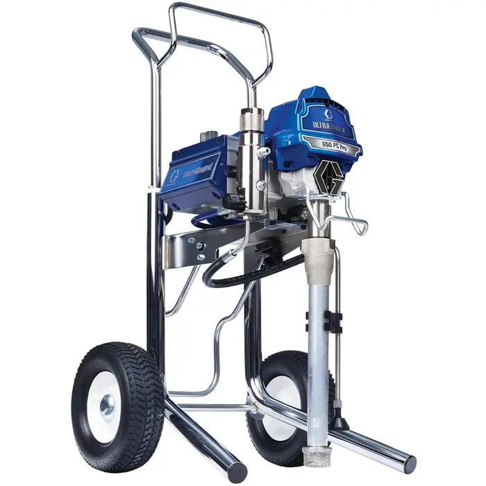 The Graco Ultra Max II 650 PC Pro Electric Airless Sprayer is the lightest weight 2‐gun electric airless sprayer. It is a true workhorse – delivering the perfect combination of quality, performance, portability and durability. Large Sprayer Performance with Mid‐Size Portability to complete jobs faster. Increased capability to handle heavier coatings and a lower cost of ownership.