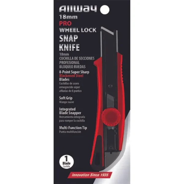 18‐Pack of 18mm Allway SK18BW Red/Black K-Series Pro Wheel Lock Blackened Steel Snap Knife with 8-Point Snap-Off Blade