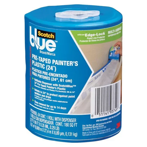 The ScotchBlue™ Pre‐taped Painter’s Plastic 24” Loaded Dispenser, with ScotchBlue™ 293 Edge‐Lock™ tape includes a refillable dispenser with ScotchBlue™ Pre‐Taped Painter’s Plastic. Features Edge‐Lock™ Paint Line Protector for super sharp paint lines. Unfolds to protect against paint spatters and drips. Offers 14‐day clean removal.