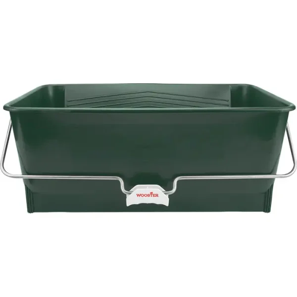 Built-in 19″ wide roll-off area for high-production jobs. No-tip design and heavy-duty 5/16″ galvanized bail with comfort grip for moving when filled. Durable, seamless, green polypropylene resists solvents and paint build up. 14″ l x 24″ w x 10″ d.