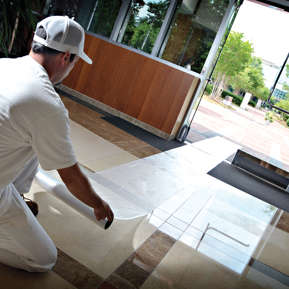 Protect your hard surfaces with Trimaco’s Easy Mask Hard Surface Protective Film. Designed for fast, hassle-free application, this floor protection film is reverse-wound for easy unrolling, allowing you to secure it quickly over countertops, tile, marble, appliances, bathtubs, showers, and more. Adhesive plastic is non-skid, ensuring it stays in place while protecting surfaces from spills, dirt, and damage without sliding or bunching. This tough, blue protective plastic film holds up against tears, punctures, and scratches, giving you dependable coverage for up to 30 days. Even though it’s built to last, it peels off easily when you’re done-leaving no sticky mess behind. Perfect for quick, reliable surface protection during construction, painting, or remodeling jobs. Do not apply to wet or damp surfaces or unfinished wood, natural marble or stone. Not recommended for on-site finished hardwood floors. On newly installed flooring, allow any curing process to completely finish before usage of this product. When adhesive plastic film may be exposed to temperatures over 95, outdoor exposure or extremely heavy traffic, film should be inspected on a weekly basis and replaced as needed.
