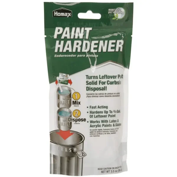 An environmentally‐friendly paint management solution that turns liquid paint solid for curbside disposal. Works with latex and acrylic paints and stains. No need to use kitty litter, or sand. Works great on cleaning up spills too.