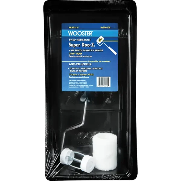 Perfect 3” size for closets, doors, trim and edging. Contains R105 deluxe trim roller for all latex or oil‐based paint, stain, varnish. Lightweight, durable paint tray made of solvent‐resistant pet, 1/2 quart capacity.