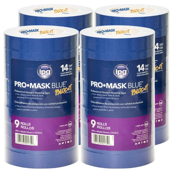 A blue, pressure‐sensitive masking tape designed for the most demanding professional painters. With its fine crepe paper backing, it provides excellent paint lines, cornering, and unsurpassed conformability. This painters’ tape will remove cleanly for up to 14 days, even with direct exposure to sunlight and high humidity. Typical applications include outdoor masking of woodwork, glass and metal surfaces, and marine painting applications. Featuring IPG’s patented Bloc‐it Clean Line Technology for the following sizes: 18mm, 24mm, 36mm, 48mm.