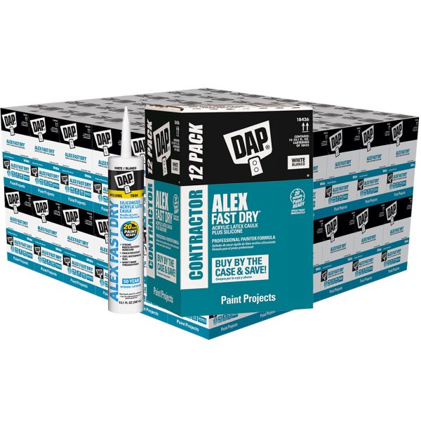 DAP ALEX FAST DRY ACRYLIC LATEX CAULK PLUS SILICONE is specifically formulated to meet the demanding needs of Professional Painters and deliver outstanding paint finish results. It can be brush painted in just 20 minutes after application or spray painted immediately, so the job gets finished faster. This durable, flexible caulk won’t crack or discolor paint and doesn’t pick up dirt. It has outstanding adhesion to a wide variety of surfaces, provides a 100% waterproof seal and cured caulk is mold and mildew resistant. It applies smoothly and easily. 50 Year Warranty. Exceeds ASTM Specification C834. Interior/exterior use.