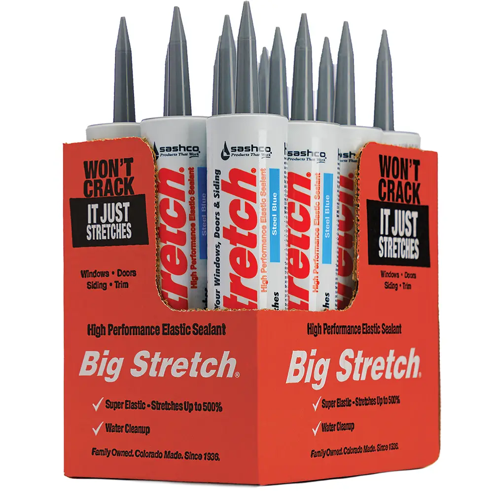 Homes move. Window frames move away from the siding or doors shift against the brick. This movement happens as the home settles as well as with temperature changes and even wind. If movement causes a sealant to crack, you can lose the air or moisture barrier in your home. That’s why you need Big Stretch. With powerful adhesion and extreme elasticity, it will stick, twist, bend, compress, and stretch ‐ 530% maximum stretch ‐ to handle most any movement your home can dish out, all without cracking.