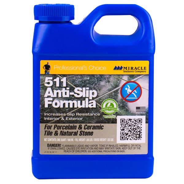 511 Anti-Slip Formula is a penetrating sealer designed for the anti-slip protection of all tile and stone surfaces. 511 Anti-Slip Formula is not a surface coating and will not alter the natural look of your surface. All surfaces treated are less slippery. Quart: 100-750 sq ft per quart.