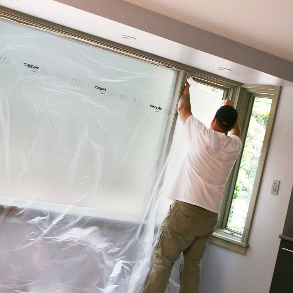 See why ClingCover Plastic Sheeting is the perfect self-adhering surface protection film for all your construction and remodeling jobs. ClingCover is a plastic film roll that will cling to almost any surface, providing reliable plastic protection. Our premium protective plastic film is treated with a unique formula that not only attracts overspray but also reduces paint flaking. Made to withstand multiple uses without making a mess, ClingCover makes painting easier, cleaner, and faster. This plastic film is designed to cling to surfaces securely, preventing any slipping or bunching. Semi-clear masking film can be used on windows to protect them while still allowing natural light to pass through, making it ideal for both indoor and outdoor projects. ClingCover is versatile and can be used for various applications, including painting, sanding, and remodeling jobs. Its ability to attract paint overspray and dust ensures that your work area remains clean and free from debris. The plastic film roll is available in two sizes, providing flexibility for different project needs.