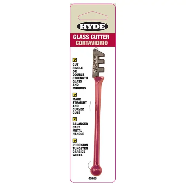 Heavy duty tungsten carbide cutting wheel for making straight and curved cuts in glass and mirrors. Carbide cuts clean and stays sharp. Balanced cast metal handle.