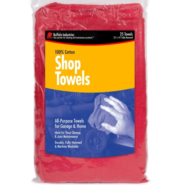 Shop Towels – Red. Classic Grease and Oil Cleanup Rag. Ideal for shop cleanup and auto maintenance. Economical grease and oil rag for the home or shop. Shop Towels are washed, dyed and dried to ensure a quality product.