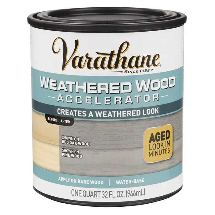 Varathane Weathered Wood Accelerator creates a weathered look on bare or untreated wood. It replicates the aging process that happens in nature by reacting with the wood to create a unique one‐of‐a‐kind aged gray look. No need to find an old barn or old wood to get a reclaimed look.